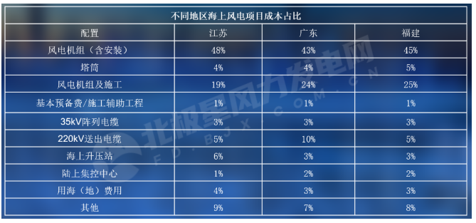 数据显示,海上风电典型造价约为17600元/kW,其中,海上风电机组及塔筒、施工建设成本、海缆、运营成本环节占初始投资的45%、27%、19%和9%;运维成本、贷款利息成本、税收成本占运营成本的48%、30%和22%,不同海域成本构成会有区别。