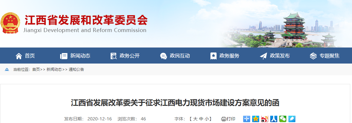 江西省发展改革委关于征求江西电力现货市场建设方案意见的函