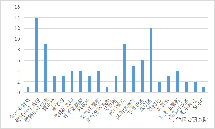 其中排在前三位的分别是燃料电池系统(14家)、氢制备(12家)、燃料电池电堆(9家)、阀门管路(9家),这与当前国内氢能和燃料电池汽车产业发展现状比较契合。