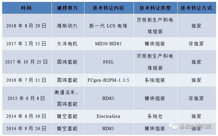 技术授权与转让。巴拉德与中国的关系最早始于2013年,此后其逐步向多家中国企业进行燃料电池技术授权,在中国建立产线,向中国燃料电池汽车提供巴拉德的产品,但核心的膜电极和电堆技术仍掌握在巴拉德的手中。