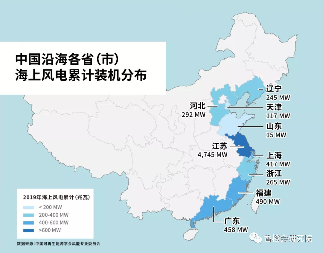图2.3 我国2019年沿海各省(市)海上风电累计装机量
