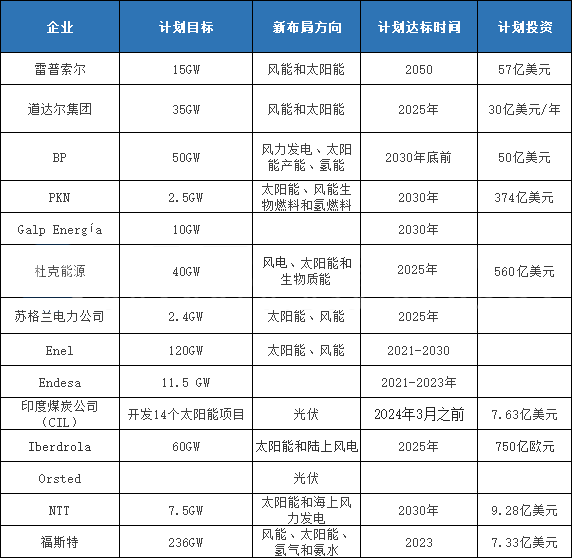 随着全球能源加速向低碳转型,新能源行业爆发出的巨大潜力吸引了更多海外巨头加码布局,并陆续发布了未来5-10年布局新能源的规划。据不完全统计,自年初以来道达尔、BP、PKN、Galp Energía、杜克能源、Endesa、NTT等多个领域的巨头发布了近590GW新能源装机容量,累计超过1215亿美元的投资计划。