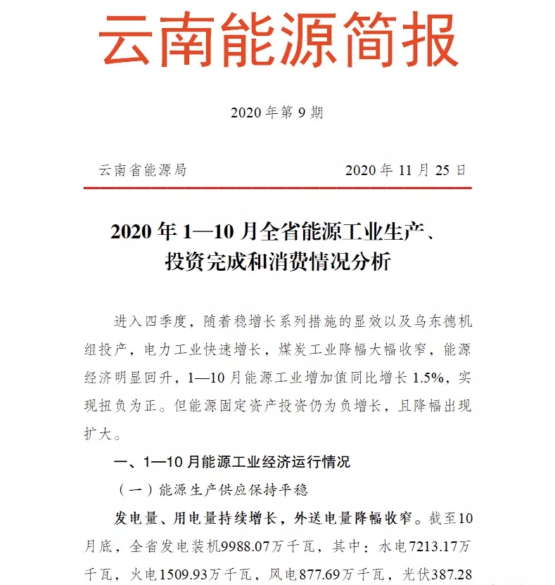 西电东送继续超出计划送电量。云南电网公司积极克服疫情不利影响,持续推进西电东送,最大限度消纳云南清洁能源。1-10 月西电东送电量达 1286.5 亿千瓦时,较年度计划增送254.56亿千瓦时,风电、光伏基本全额消纳。根据云南电网官方信息显示: