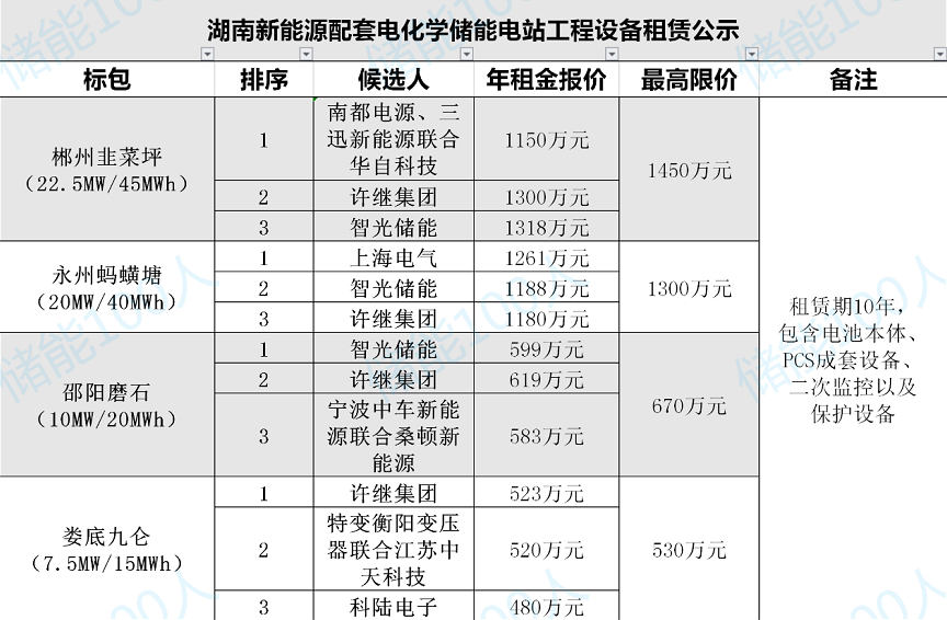 湖南新能源配套储能120MWh核心设备租赁公示,上海电气、智光、许继、南都电源联合体预中标