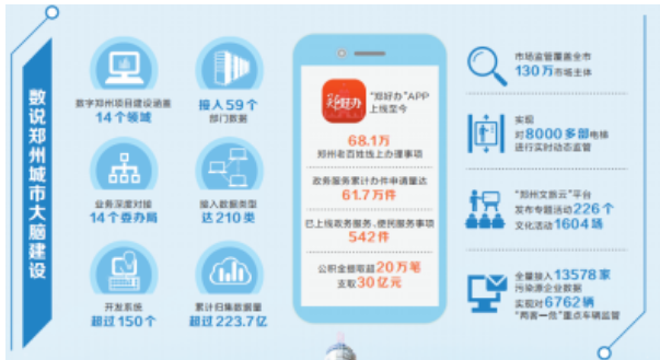 据介绍,2019年8月,郑州市全面启动“城市大脑”建设,目前郑州城市大脑已建成集政务服务、公共服务、便民服务于一体的综合性服务平台,稳步推进涵盖政务服务、城市管理、生态环境、交通出行等14个业务领域的系统建设,开发系统超过150个、接入59个部门数据,完成118个应用场景,累计归集数据量超过223.7亿。一个“能看见、能感知、会计算”,未来还将更智能的郑州城市大脑已初步建成。