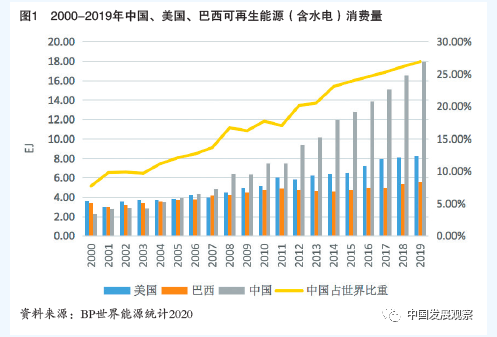 2019年,我国可再生能源(含水电)消费总量达到17.95EJ(1EJ (艾焦)是10的18次方J。1千焦等于34毫克标准煤),与2000年相比,我国可再生能源(包括水电) 消费总量增长了6.95倍,而同期一次能源消费总量仅增长2.34倍(文中数据如果不特别注明,均来自《BP世界能源统计2020》——作者注)。自2005年可再生能源(含水电)消费量超过巴西和美国后,我国就成为全球最大的可再生能源(含水电)消费国,同时也是最大的生产国(可再生能源除了生物质能外,太阳能、风能、水能不易储存,因而消费量与生产量相差不大)。2019年我国占全球可再生能源(含水电)消费量份额高达26.94%。