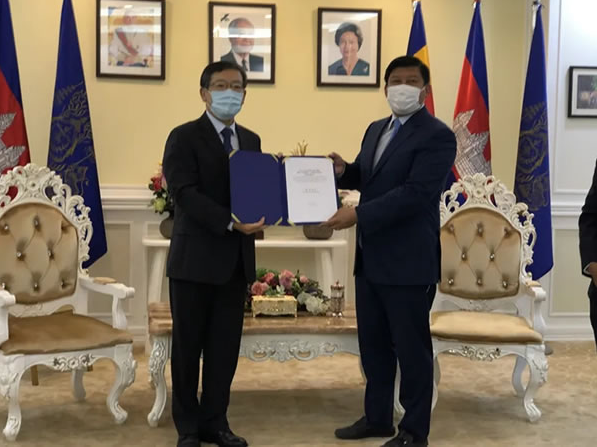 12月21日,中国驻柬埔寨大使王文天同柬环境大臣赛桑奥共同出席中国生态环境部向柬环境部捐赠绿色低碳设备交接仪式。