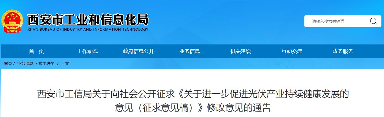 西安市工信局关于向社会公开征求《关于进一步促进光伏产业持续健康发展的意见(征求意见稿)》修改意见的通告