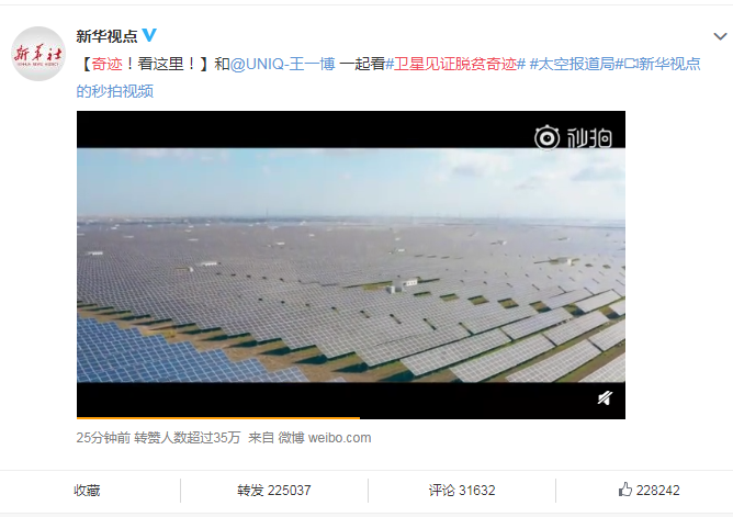 近日,当红艺人王一博以“脱贫见证人”的身份,转发了新华视点在微博平台发布的视频《卫星见证脱贫奇迹》。
