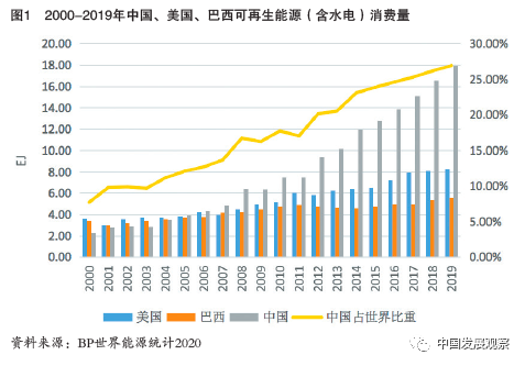 2019年,我国可再生能源(含水电)消费总量达到17.95EJ(1EJ (艾焦)是10的18次方J。1千焦等于34毫克标准煤),与2000年相比,我国可再生能源(包括水电) 消费总量增长了6.95倍,而同期一次能源消费总量仅增长2.34倍(文中数据如果不特别注明,均来自《BP世界能源统计2020》——作者注)。自2005年可再生能源(含水电)消费量超过巴西和美国后,我国就成为全球最大的可再生能源(含水电)消费国,同时也是最大的生产国(可再生能源除了生物质能外,太阳能、风能、水能不易储存,因而消费量与生产量相差不大)。2019年我国占全球可再生能源(含水电)消费量份额高达26.94%。