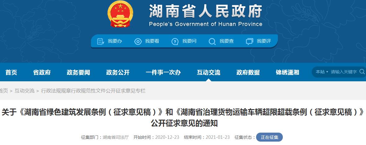 关于《湖南省绿色建筑发展条例(征求意见稿)》和《湖南省治理货物运输车辆超限超载条例(征求意见稿)》公开征求意见的通知