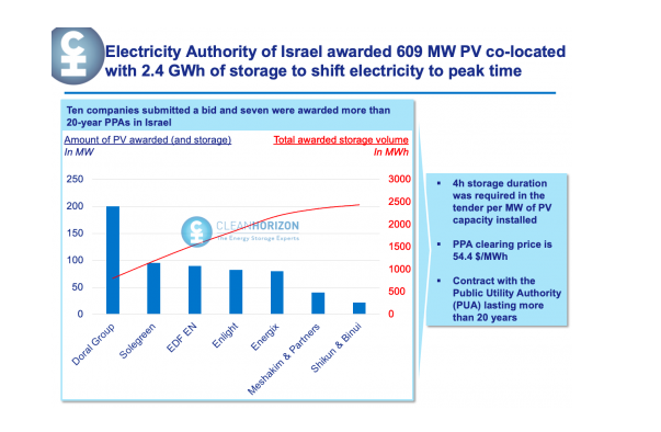 招标过程于2020年底结束,以色列电力管理局(PUA)以0.0544美元/kWh的清算价格授予并网的太阳能发电设施和持续放电时间为4小时储能系统。以色列电力管理局(PUA)总共收到10家公司55个投标书,这些投标书中的太阳能发电设施装机容量总计为870MW。该机构接受了其中7个公司33个投标书,这些投标书中的太阳能发电设施总装机容量为608.95MW,储能系统的总容量为2,400MWh以上。