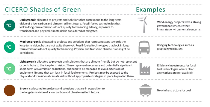 挪威国际气候研究中心CICERO绿色债券评级机构(CICERO Green)跟据投资项目对气候、环境的影响绿色债券分为深绿、中绿、浅绿三种,为投资者提供透明度。