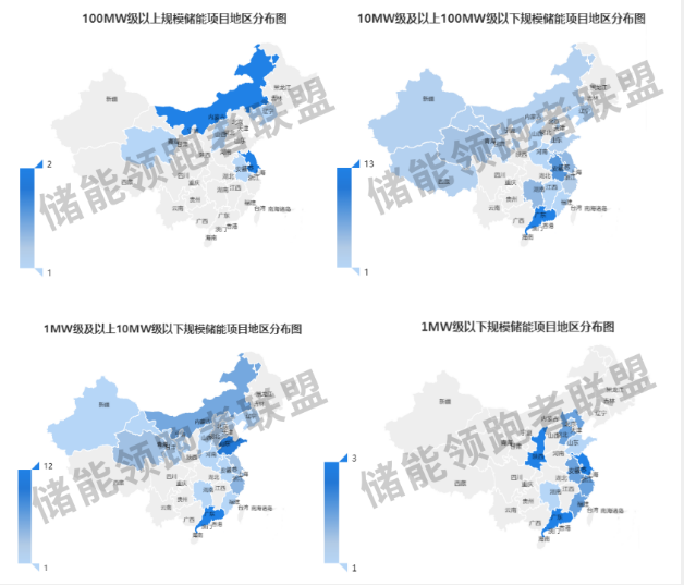 100MW级及以上规模储能项目共有8个,主要位于内蒙古自治区、江苏省、安徽省、山西省等6地。10MW级及以上100MW级以下规模的有57个,主要位于广东省、江苏省、安徽省、湖南省等18地。1MW级及以上10MW级以下规模的59个储能项目,主要位于广东省、山东省、江苏省、浙江省等18地。1MW级以下规模的20个储能项目,主要位于广东省、江苏省、陕西省、浙江省等10地。