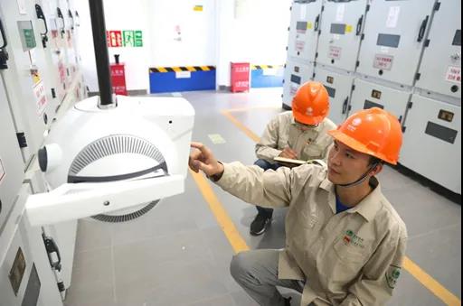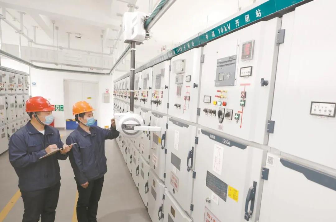 ▲国网北京石景山供电公司员工在首钢冬奥供电服务中心巡视设备。