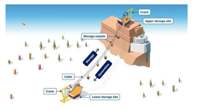 Hunt和他的合作者设计了一种新的系统来解决锂离子电池长期用于储能:山地重力储能,简称MGES。与水力发电类似,MGES包括在海拔高度储存物质以产生重力能。当储存的物质下落并转动涡轮机发电时,能量被回收。该团队在11月6日发表在《能源》杂志上的一篇论文中描述了它的系统。Hunt解释说:“我们建议建造一个大的沙砾水库,而不是建一座大坝。”MGES的关键在于找到两个海拔高度相差1000米的山顶地点是理想的。“高差越大,技术就越便宜,”他说。这些地点看起来很相似,每一个地点都有一个类似矿山的砂或砾石储存站和一个正下方的加油站组成。阀门将材料释放到等待的容器中,然后通过起重机和电机电缆将其运送到上层现场。在那里,沙子或砾石被储存了几周,几个月,甚至几年,直到可以使用为止。当物质被移回山下时,储存的引力能被释放并转化为电能。该系统非常灵活,Hunt说,因为你可以很容易地改变电缆的速度,增加负载,或改变船只的数量,以满足不同的能源需求。Hunt说,与抽水蓄能水电站和大坝等传统的长期蓄水方法相比,MGES的效果更好,因为它对环境的影响很小。而且,成堆的沙子很便宜,比水还便宜。沙子不会蒸发,所以你可以继续无限期地使用它。Hunt估计,通过这个系统储存能量的年成本将在每兆瓦时50至100美元之间变化。