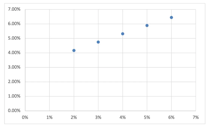 图2 股权IRR8%的情况下不同长期贷款利率(横轴)下项目IRR要求(纵轴)(假设同图1)