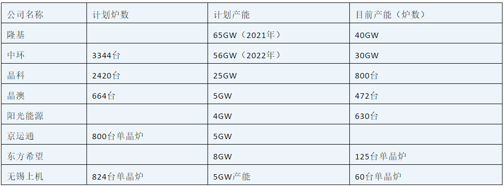 3、硅料扩产,一直是国内两大厂家的目标,截止到2019年6月,中环股份光伏硅单晶实现月产量突破万吨,产能达到30GW,未来五期项目建设达产后,产能将突破56GW,全球市场占有率达到45%。隆基2019年产能将接近40GW,2020年产能将达到65GW,未来将超过90GW。晶科规划产能25GW。目前新疆晶科产能7GW,800台单晶炉,计划再上240台单晶炉;乐山晶科规划产能8GW,总共900台单晶炉,目前已经开始生产;西宁晶科规划480台炉子。晶澳是国内最早的民营单晶企业,在2015年以前,其拉晶成本比隆基还低。目前晶澳有5GW左右的产能,包头晶澳有192台120单晶炉,邢台晶龙有160台比较老的单晶炉,松宫120台老单晶炉,曲靖晶龙目前正在建设厂房,计划上192台140炉,越南晶澳计划上160台单晶炉。