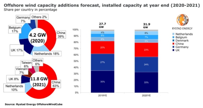 根据知名能源咨询公司Rystad Energy数据统计,尽管受新冠疫情影响,2020年全球海上风电新增装机4.2GW,同比增长15%,总装机达到31.9GW。同时,该机构预测今年全球将新增装机11.8GW,同比增长37%,最终装机达到43.7GW。