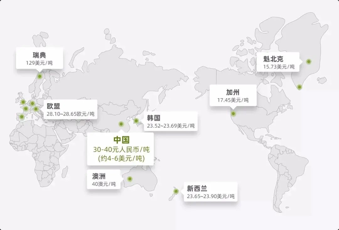 全球主要市场碳价格(数据来自于全球主要碳交易所)
