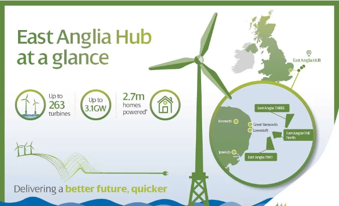 East Anglia海上风电集群位于英格兰东部海岸,由East Anglia ONE North、East Anglia TWO、East Anglia THREE三个场址组成,总装机容量达到了3.1GW,总投资约65亿英镑(约合人民币573亿元),建成后可为270万户英国家庭供电 。