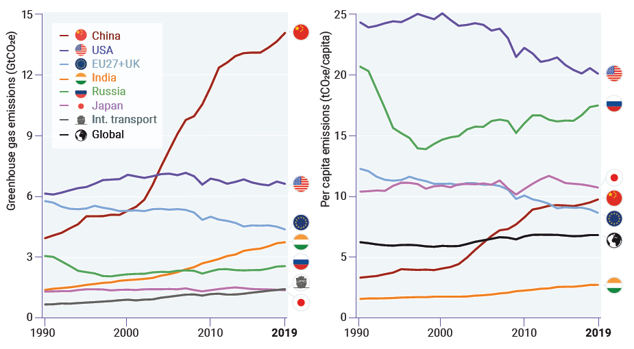 ▲ 全球六大温室气体排放国 (左)绝对排放量 (右) 人均排放量. 来源《2020年排放差距报告》