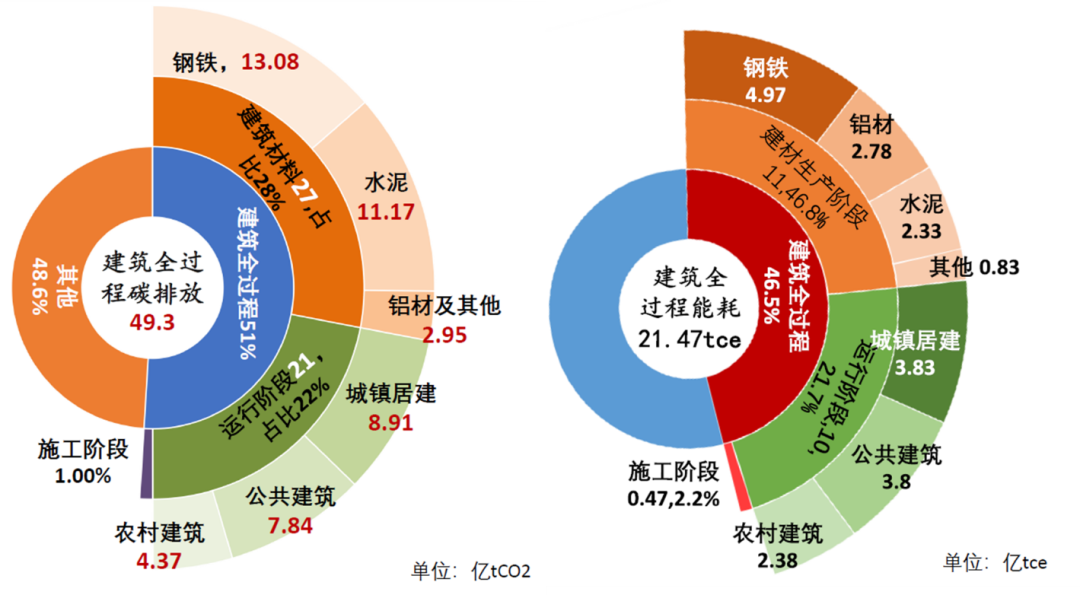 ▲ 建筑全过程能耗(左)和碳排放(右)数据分析