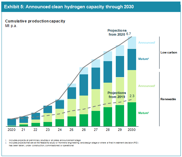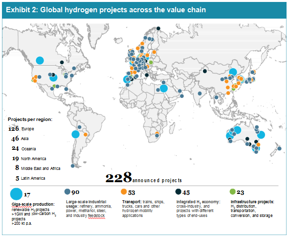 在政府财政和监管的支持下,全球向脱碳方向的转变正支撑这一势头发展。国内生产总值占据世界一半以上的75个国家有零碳发展目标,30个有氢能规划。