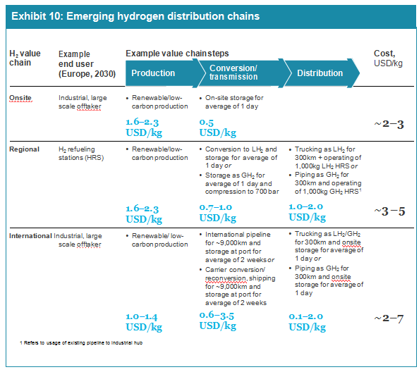 从短期到中期来看,大规模清洁氢气应用中最具竞争力的设置包括在现场或附近同时进行制氢。然后,利用这种规模化生产向附近的其他氢气用户(如卡车和火车加油站)和较小的工业用户供应燃料。用卡车运送燃料给这些用户通常是最具竞争力的配送方式,每公斤氢气的成本低于1美元。对于长距离的船上运输,氢气需要转换以增加其能量密度。