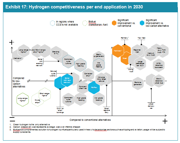 从总体拥有成本(TCO)的角度(包括制氢、分销和零售成本)来看,氢能是22种终端应用中最具竞争力的低碳解决方案,包括长途卡车运输、航运和钢铁。然而,纯TCO并不是唯一驱动因素:未来对环境法规的期望、客户的需求和相关的“绿色溢价”,以及ESG合规投资的较低资本成本都将影响投资和购买决策。