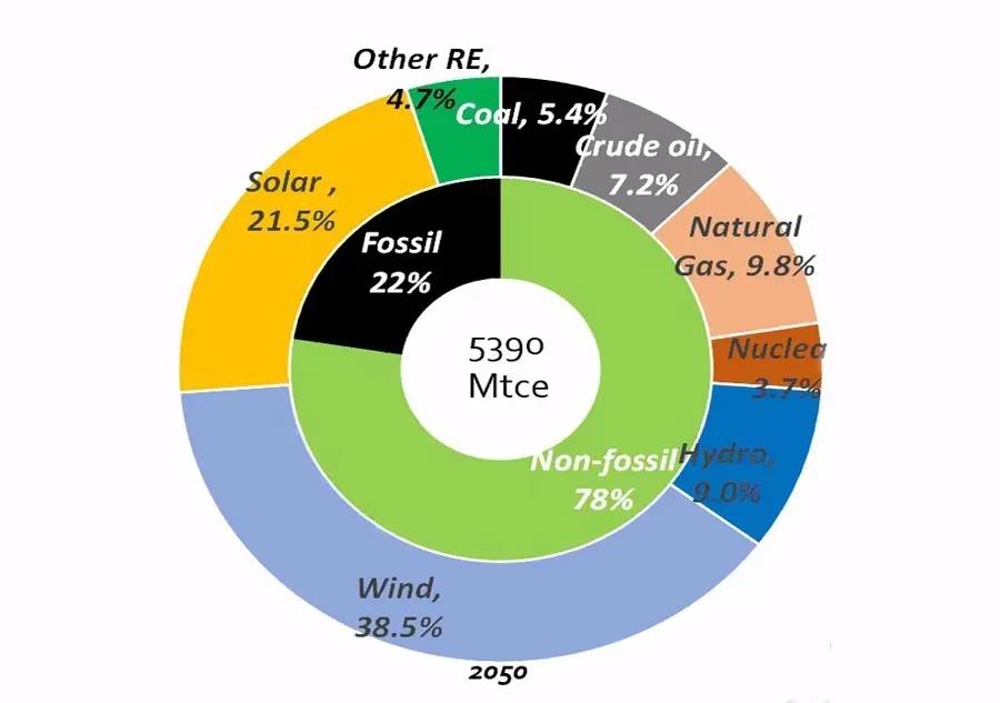 根据《2020年中国可再生能源展望报告》,为了实现《巴黎协定》将全球温度升高控制在2摄氏度以下的目标。中国非化石能源比重未来会持续高速增长,十四五达到25%,十五五达到34%,十六五达到42%。最终到2050年,中国非化石能源比重将提升至78%,煤炭消费相比2019年下降90%,二氧化碳排放相比2019年下降76%。到2050年,中国风电将占到能源消费的38.5%,光伏占到21.5%,排在之后的是天然气占9.8%,水电占9%。