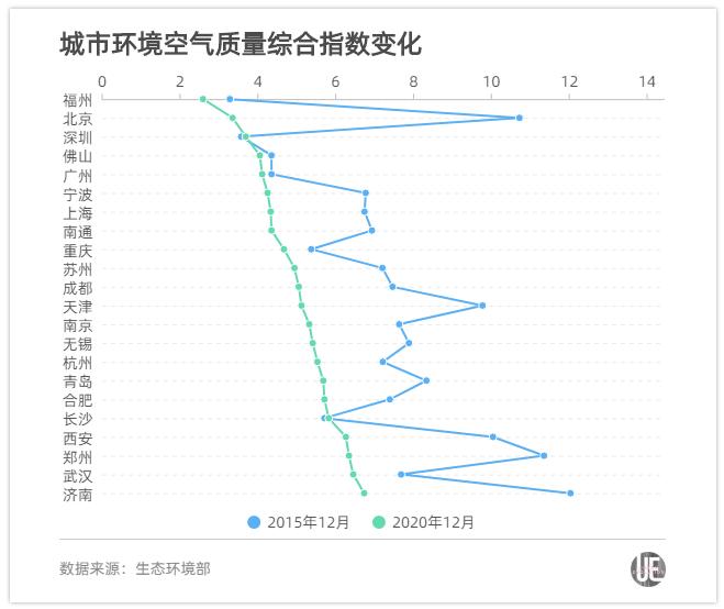 根据生态环境部披露的“城市空气质量状况月报”,城叔将22座城市(无泉州数据)2015年12月、2020年12月的两个月度数据进行对比,试图以此管中窥豹。