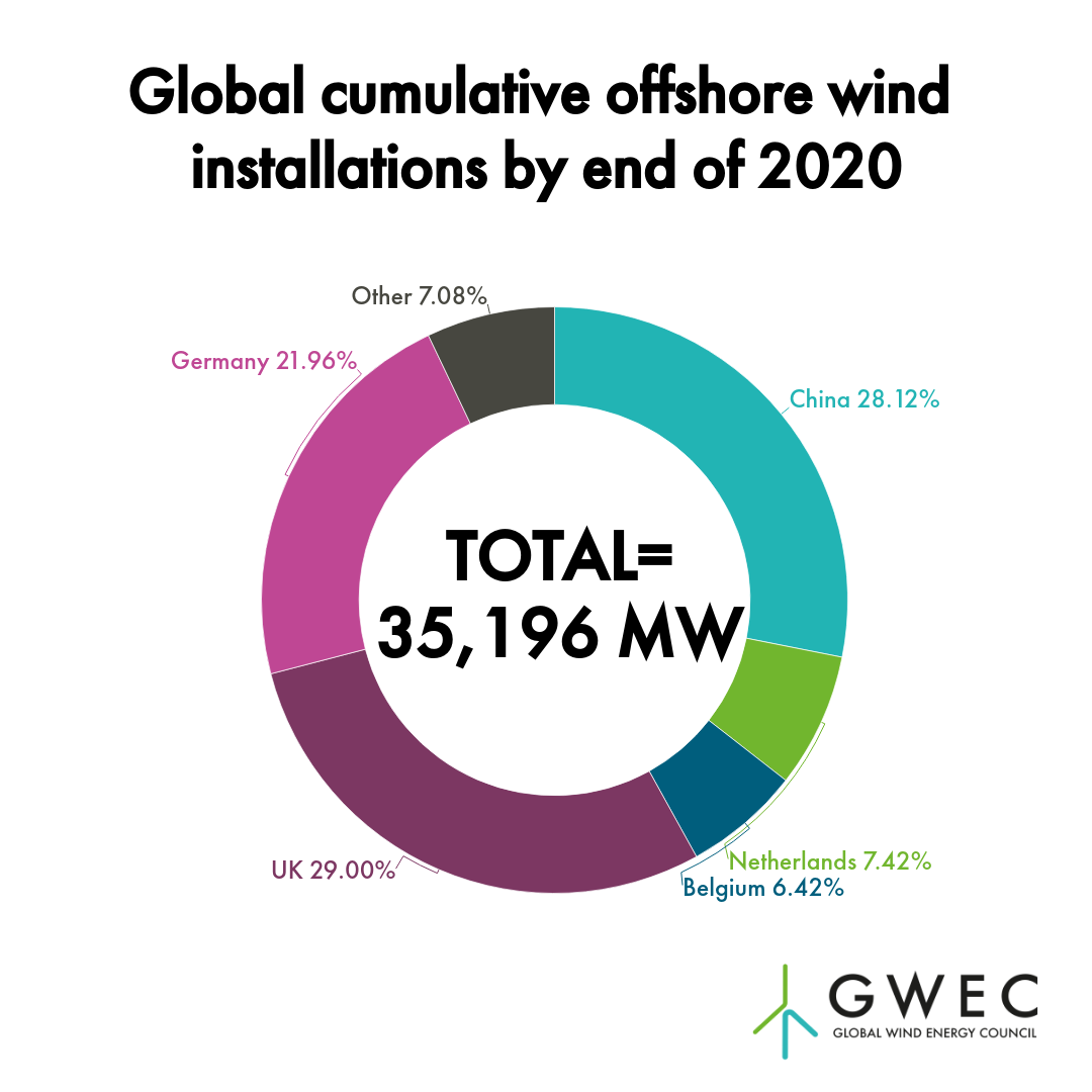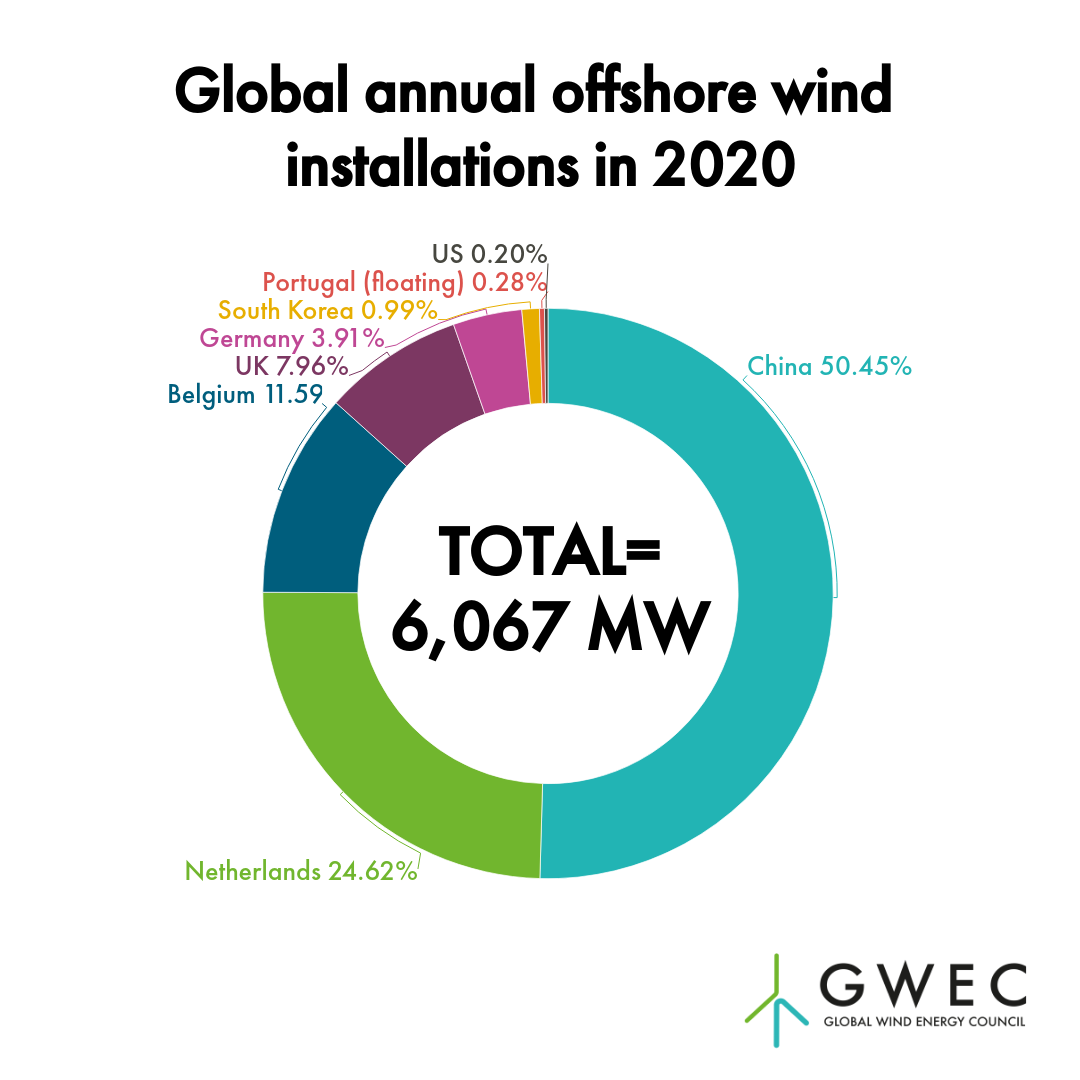 中国2020年海上风电新增装机量超过3吉瓦,占全球新增装机的50.45%;海上风电总容超过德国,仅次于英国,成为全球第二大海上风电市场。