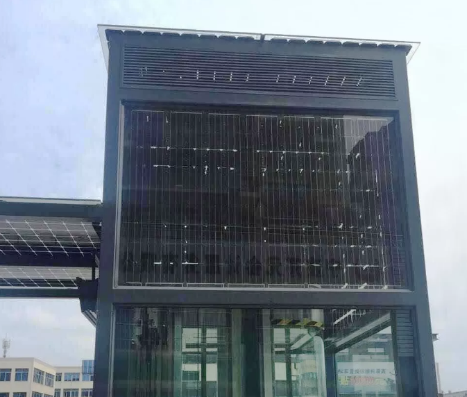 太阳能玻璃幕墙通过采集光能,为电梯供电,从而带动电梯内的照明和换气系統等用电设备。全玻光伏组件采用低透光率设计,为电梯提供更多的电量,同时光伏组件整体与电梯框架格调一致,使整座电梯美丽大方,充分体现了“绿色、环保、节能”的主题。