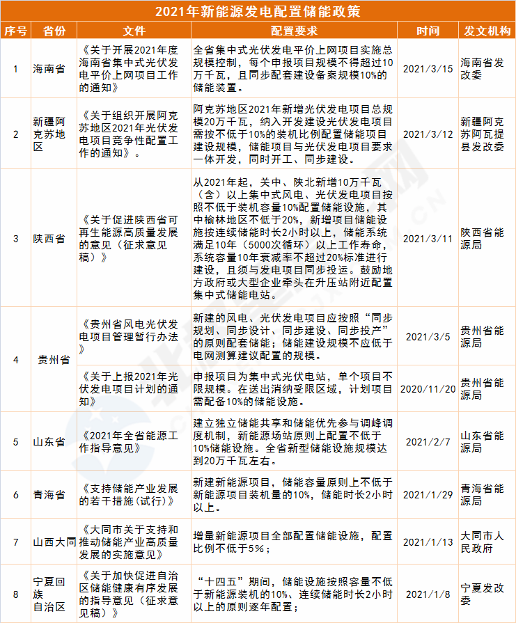 3月15日,海南发改委发布《关于开展2021年度海南省集中式光伏发电平价上网项目工作的通知》,其中明确每个申报项目规模不得超过10万千瓦,且同步配套建设备案规模10%的储能装置。2021年截至目前,明确提出新能源发电配置储能比例的地区已达八个省份。