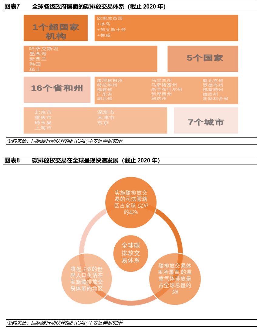 碳市场是推进碳中和的经济保障:碳排放权交易系统(ETS)是一个基于市场的节能减排政策工具,合理的政策能够为实现碳中和提供最确定、最具成本效益的解决方案。国外已经形成了五大相对成熟的多样化的碳排放权交易体系。我国在开展了试点市场、CDM以及CCER的基础上,于2021年2月1日正式开放全国统一的碳交易市场。
