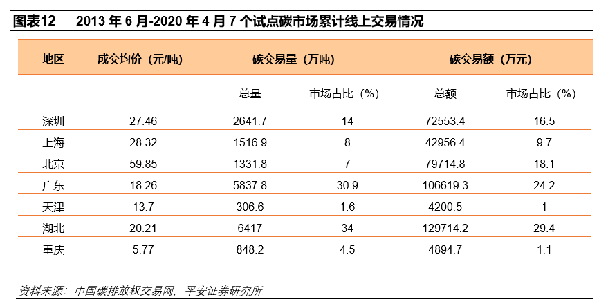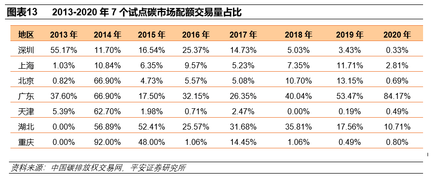 《管理办法》落地前,中国自2013年始在北京、上海、广州、深圳等省市开展了碳排放权交易试点,最终共成交4.55亿吨,成交金额累计105.5亿元,但如此之小的总交易量显然与我国动辄百亿吨的年度碳排放量不相匹配。除此以外,还存在着成交量受履约驱动影响、履约推迟严重、市场信息披露不足等问题。