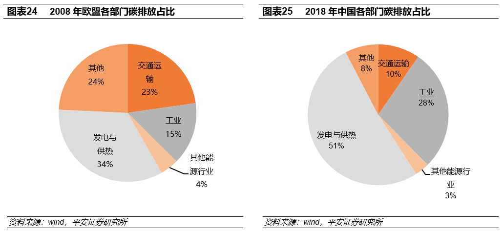 中国:碳排放主要来自于化石能源燃烧过程,以煤炭为主的能源结构决定了煤炭是我国碳排放的主要来源。根据IEA数据,分能源看,2018年煤炭产生的碳排放占全国碳排放的80%;分部门看,2018年电力和热力部门产生的碳排放占全国碳排放的51.4%,欧盟电力和热力部门碳排放也是占比最高。