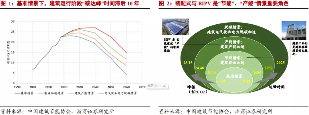 我们认为:“碳达峰、碳中和”目标下,支撑未来建筑业转型的双主线是“节能”和“产能”,建筑工业化和建筑光伏一体化(BIPV)为具体实现路径。装配式建筑作为建筑工业化的主抓手,可在建造、内装修、后期使用等全寿命周期减少能源消耗;BIPV(建筑光伏一体化)是目前较为成熟的实现建筑“产能”的路径,两者在“节能”和“产能”两大情境下有望发挥重要作用。