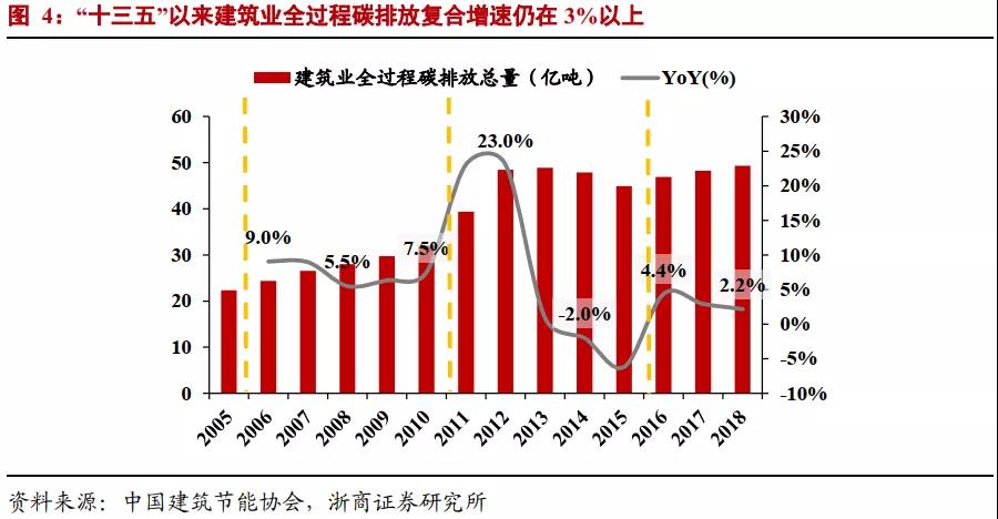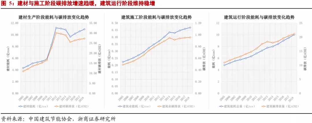 “十三五”以来建筑业碳排放增速放缓,但年复合增速仍达3.1%。“十一五”期间,建筑业全过程碳排放维持高位增长,年复合增速达7.5%;“十二五”期间建筑业全过程碳排放高增后回降,年复合增速7.0%;“十三五”以来建筑业碳排放增速趋缓,但年复合增速仍达3%以上,从细分环节看,建材和施工阶段碳排放增速显著放缓,建筑运行阶段碳排放维持稳增。