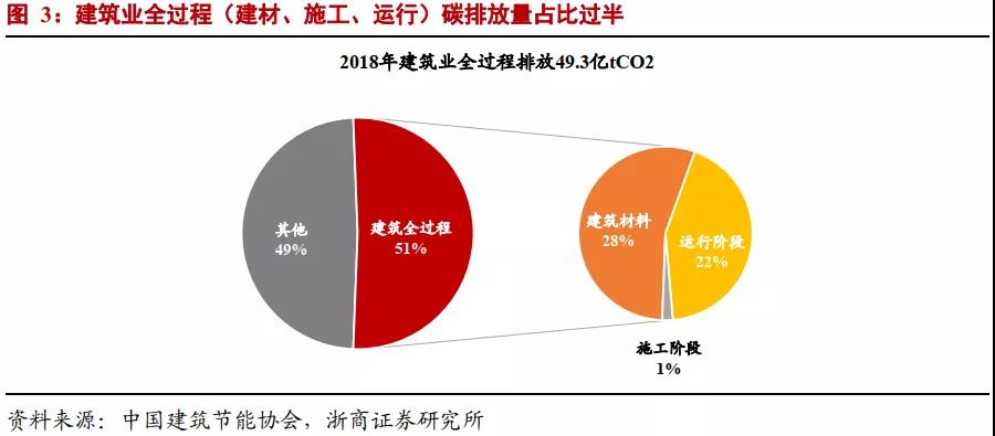 建筑业全过程碳排放占比高达51%,其中建筑运行阶段占比22%,施工阶段占比1%,双碳目标下减排压力大。根据中国建筑节能协会发布的《中国建筑能耗研究报告(2020)》,2018年建筑业全过程排放49.3亿吨CO2,占全国碳排放总量的51%,其中建筑材料碳排放占比28%,建筑运行阶段碳排放占比22%,建筑施工阶段碳排放占比1%。建筑业碳排放占比过半,为顺利实现“碳达峰、碳中和”双碳目标,减排压力较大。