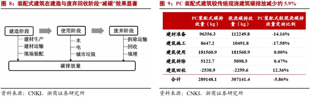 政策端推动绿色建筑,装配式得天独厚。2020年7月,住建部、发改委等7部委局联合发布《绿色建筑创建行动方案》,要求到2022年,当年城镇新建建筑中绿色建筑面积占比达到70%。2021年1月,住建部发布《绿色建筑标识管理办法》,对绿色建筑星级授予做出详细规定,政策端持续发力推动绿色建筑建设。全生命周期看,相较于传统现浇建筑,装配式建筑在建造与废弃回收环节具有“减碳”特性,利用实际工程项目数据,汤煜、周观根等学者研究表明:PC、钢结构装配式建筑较传统现浇建筑碳排放分别减少约5.9%、30%。