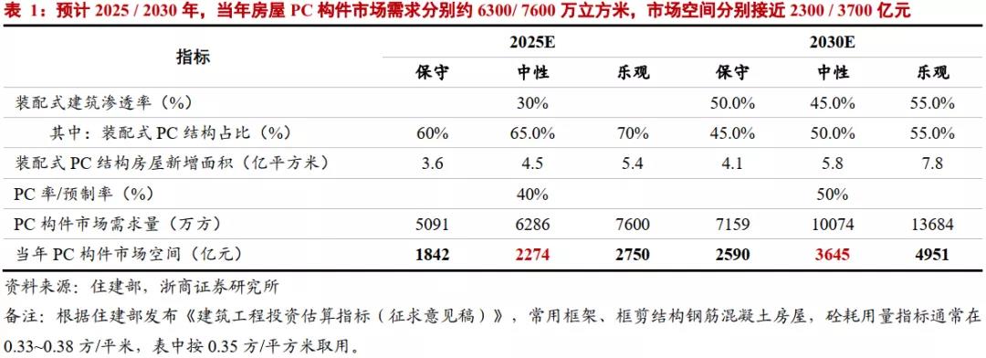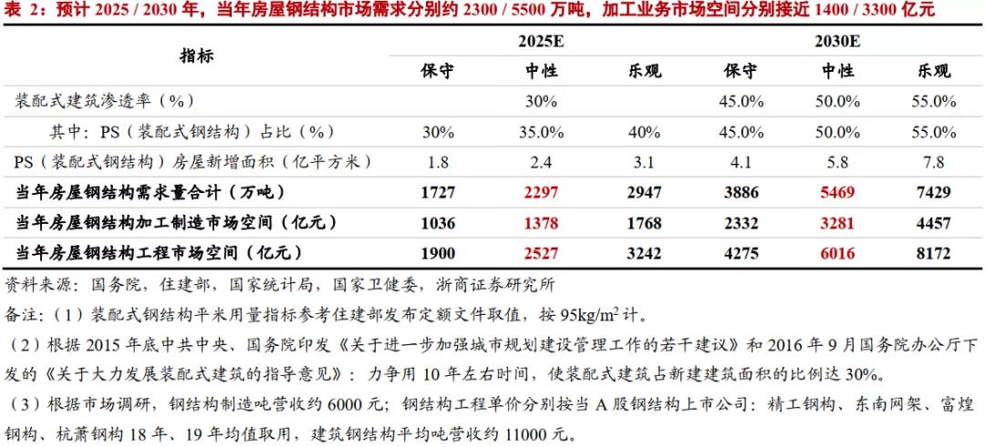 在此基础上,根据住建部对装配式建筑渗透率指标要求,结合PC/钢结构市场占比及单位价格,测算得到:中性估计下,2025年,PC构件制造/钢结构加工/钢结构工程业务市场空间有望分别2300亿元/年、1400亿元/年、2500亿元/年。