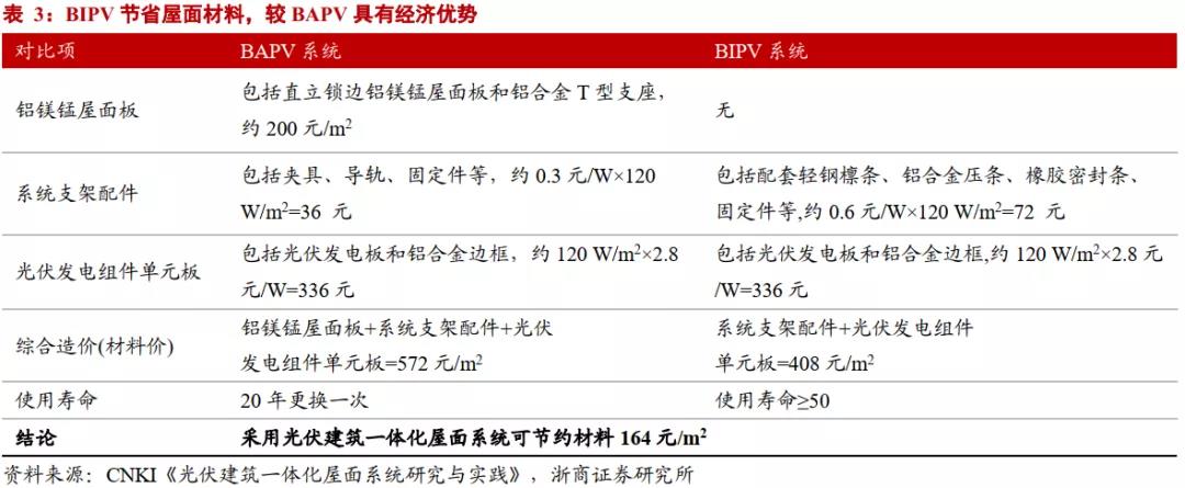 从全寿命周期看,BIPV相比BAPV成本优势逐步显现。BIPV指将光伏产品集成到建筑上,相较将光伏系统附着在建筑上的BAPV体系,BIPV产品直接取代了原始的建筑屋面材料,节省建安成本并提高接光率,提升装机容量。