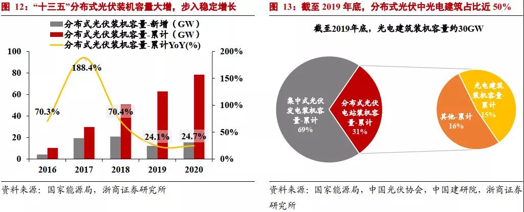 “十三五”期间分布式光伏累计装机容量大幅增长,截至2019年底光电建筑装机占比近50%。2016-2020年,分布式光伏累计装机容量CAGR+66%,其中2017、2018年新增装机容量达到峰值,2019、2020年新增装机容量有所减少,累计装机容量增速分别为24.1%,24.7%,增长逐渐趋于稳定。截至2019年底,光电建筑累计装机容量约30GW,约占光伏电站累计装机容量的15%,在分布式光伏累计装机容量中占比近一半。