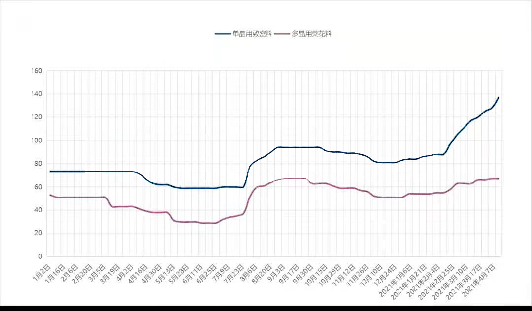 据北极星太阳能光伏网跟踪PVInfoLink每周报价,从去年底至今,多晶硅料价格一路走高,本周单晶用致密料均价137元/kg,较年初上涨65%,高价冲破140涨至145元/kg;多晶用菜花料最高价77元/kg,市场均价67元/kg,较年初上涨31%。