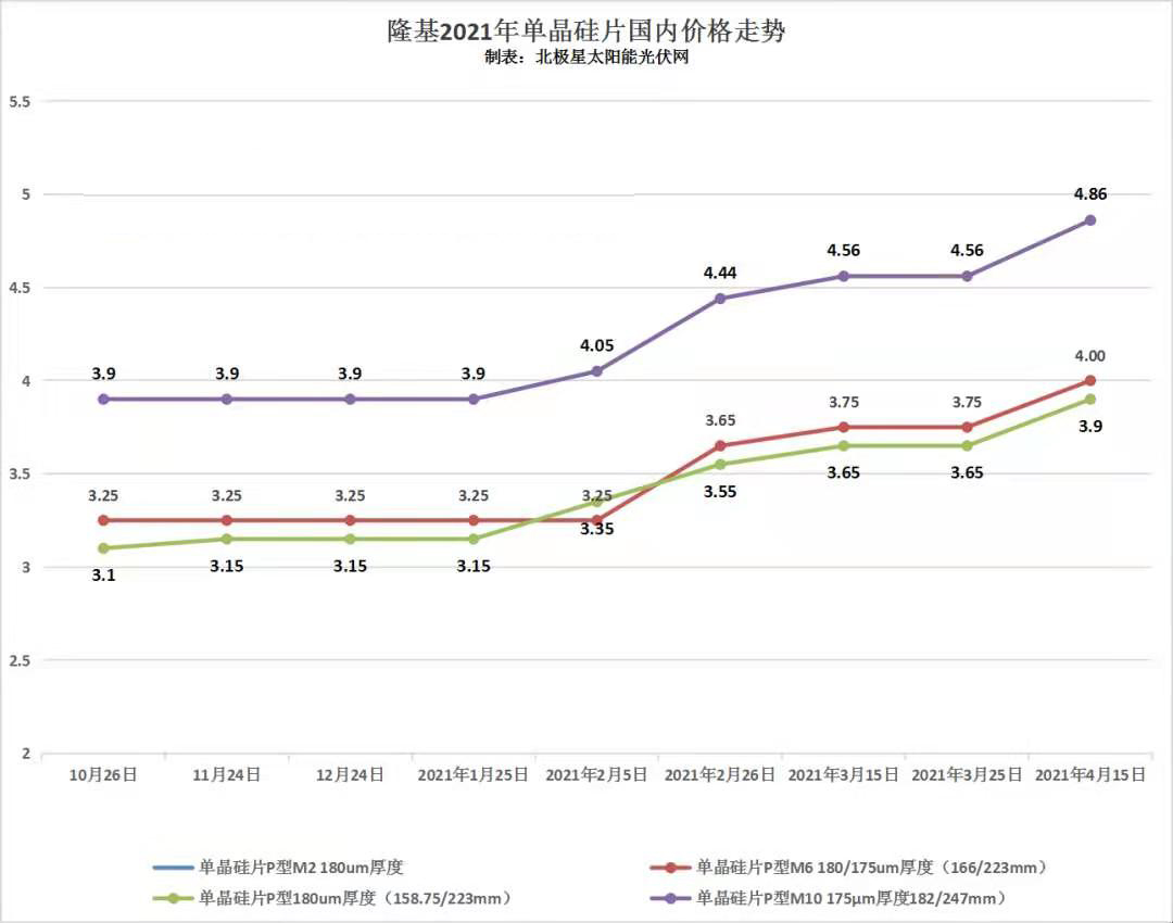 涨价继续向下传导,4月15日隆基公布最新单晶硅片报价,G1、M6、M10价格全线上涨,最高涨幅6.8%;4月10日另一大单晶硅片巨头中环股份同样上调G12、M6、G1全部报价,最高涨0.3元/片。