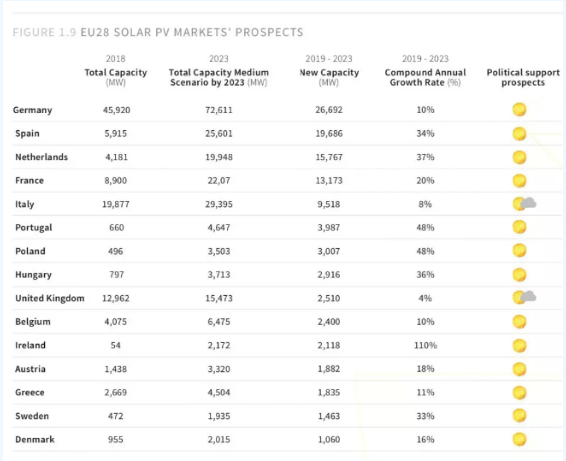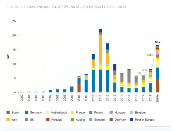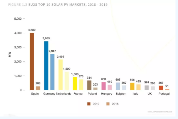 欧洲出现新的太阳能大跃进的原因关键是光伏的市场竞争力,光伏比当今任何其他发电来源都便宜,而且这种趋势仍在持续。欧盟太阳能增长的另外的主要因素是成员国在接近其约束力的最后期限完成2020年国家可再生能源目标。并为2030年实现清洁能源计划中32%的可再生能源目标做准备。