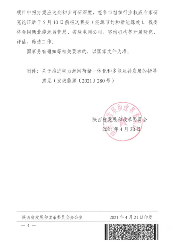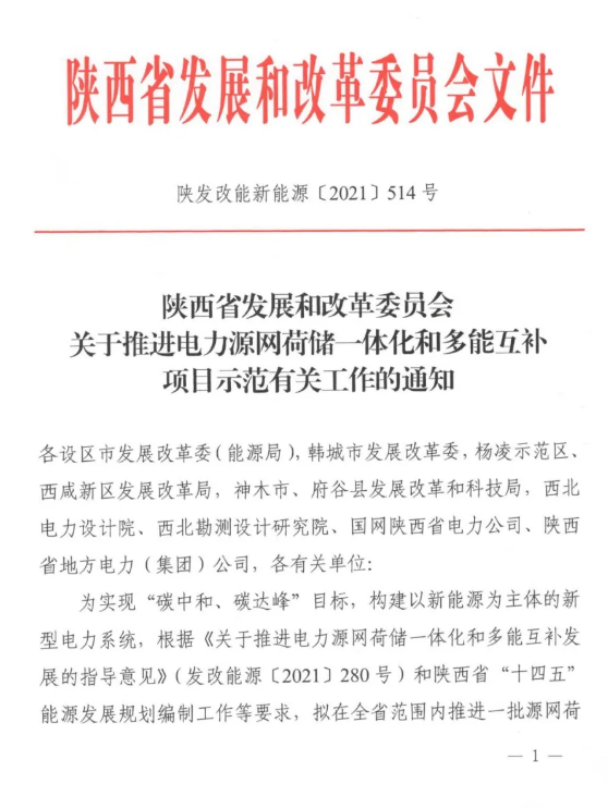 2021年4月20日,陕西省发改委下发文件称,为实现“碳中和、碳达峰”目标,构建以新能源为主体的新型电力系统,根据《关于推进电力源网荷储一体化和多能互补发展的指导意见》和陕西省“十四五”能源发展规划编制工作等要求,拟在全省范围内推进一批源网荷储一体化和多能互补示范项目。据了解,新增跨省跨区外送通道和增量“风光火(储)一体化”项目不在本次申报范围之内。