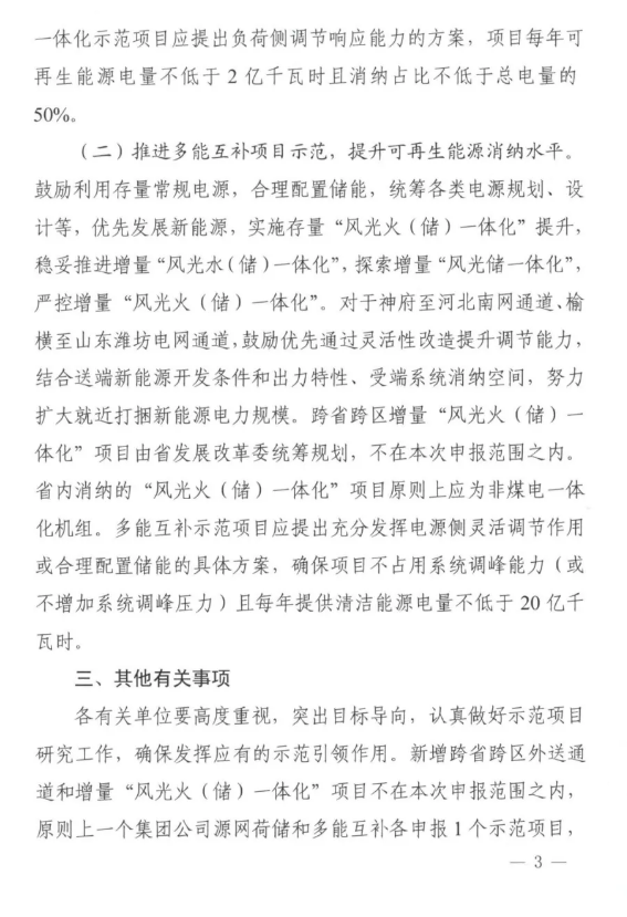 推进多能互补项目示范方面,对于神府至河北南网通道、榆横至山东潍坊电网通道,鼓励优先通过灵活性改造提升调节能力,结合送端新能源开发条件和出力特性、受端系统消纳空间,努力扩大就近打捆新能源电力规模。跨省跨区增量“风光火(储)一体化”项目由省发展改革委统筹规划,不在本次申报范围之内。省内消纳的“风光火(储)一体化”项目原则上应为非煤电一体化机组。多能互补示范项目应提出充分发挥电源侧灵活调节作用或合理配置储能的具体方案,确保项目不占用系统调峰能力(或不增加系统调峰压力)且每年提供清洁能源电量不低于20亿千瓦时。